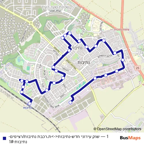 The first stop of the 1 bus route is שוק עירוני חדש and the last stop is ת.רכבת נתיבות/רציפים. 1 (שוק עירוני חדש-נתיבות<->ת.רכבת נתיבות/רציפים-נתיבות-1#) is operational during ежедневно.