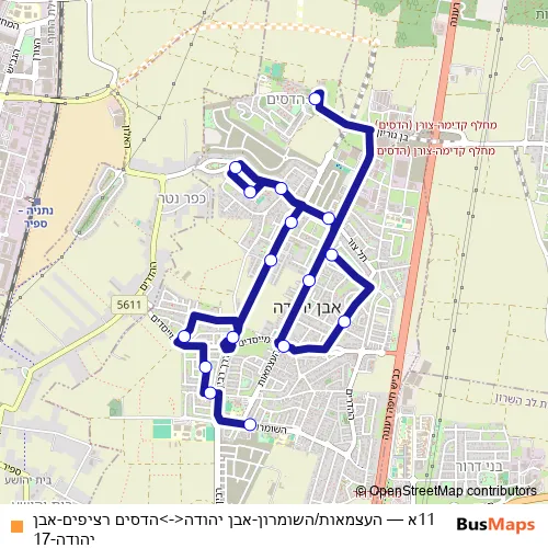 The first stop of the 11א bus route is העצמאות/השומרון and the last stop is הדסים רציפים. 11א (העצמאות/השומרון-אבן יהודה<->הדסים רציפים-אבן יהודה-17) is operational during ежедневно.