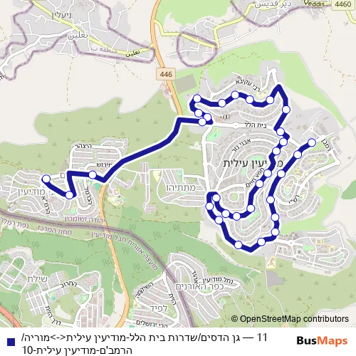 The first stop of the 11 bus route is גן הדסים/שדרות בית הלל and the last stop is מוריה/הרמב'ם. 11 (גן הדסים/שדרות בית הלל-מודיעין עילית<->מוריה/הרמב'ם-מודיעין עילית-10) is operational during ежедневно.