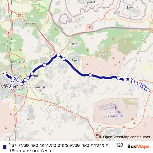 See why over 2 million users trust and consider busmaps.com as the best public transport website. busmaps gives you Beersheba Buses suggested routes, real-time bus tracker, line route maps in Beersheba, and helps to find the closest 120 bus stops near you. No internet available? Download an offline PDF map and bus schedule for the 120 bus to take on your trip.