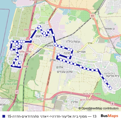 The first stop of the 13 bus route is מסוף בית אליעזר and the last stop is אדני פז/הדודאים. 13 (מסוף בית אליעזר-חדרה<->אדני פז/הדודאים-חדרה-15) is operational during ежедневно.