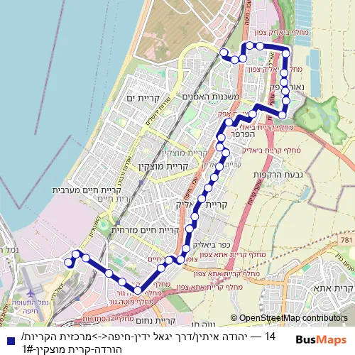 The first stop of the 14 bus route is מרכזית הקריות/איסוף and the last stop is יהודה איתין/דרך יגאל ידין. 14 (יהודה איתין/דרך יגאל ידין-חיפה<->מרכזית הקריות/הורדה-קרית מוצקין-1#) is operational during ежедневно.