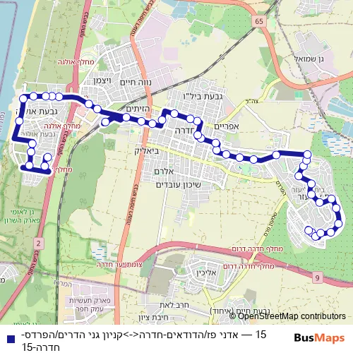 The first stop of the 15 bus route is מסוף בית אליעזר and the last stop is אדני פז/הדודאים. 15 (אדני פז/הדודאים-חדרה<->קניון גני הדרים/הפרדס-חדרה-15) is operational during ежедневно.