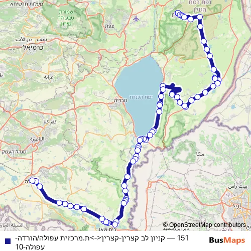 The first stop of the 151 bus route is קניון לב קצרין and the last stop is ת.מרכזית עפולה/הורדה. 151 (קניון לב קצרין-קצרין<->ת.מרכזית עפולה/הורדה-עפולה-10) is operational during ежедневно.