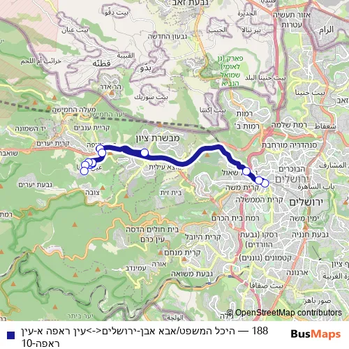 The first stop of the 188 bus route is היכל המשפט/אבא אבן and the last stop is עין ראפה א. 188 (היכל המשפט/אבא אבן-ירושלים<->עין ראפה א-עין ראפה-10) is operational during ежедневно.