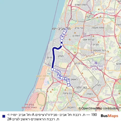 The first stop of the 190 bus route is ת. רכבת תל אביב- סבידור/רציפים A and the last stop is ת. רכבת הראשונים. 190 (ת. רכבת תל אביב- סבידור/רציפים A-תל אביב יפו<->ת. רכבת הראשונים-ראשון לציון-2#) is operational during ежедневно.