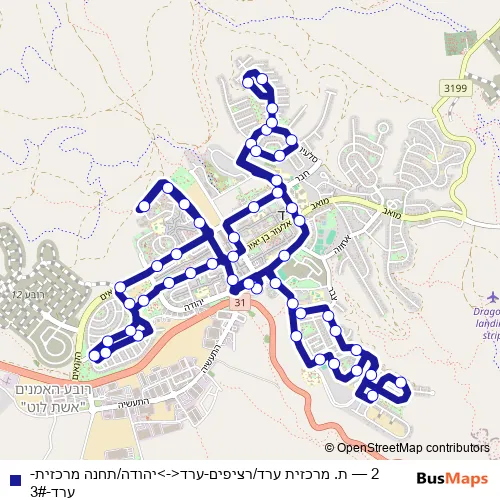 The first stop of the 2 bus route is ת. מרכזית ערד/רציפים and the last stop is יהודה/תחנה מרכזית. 2 (ת. מרכזית ערד/רציפים-ערד<->יהודה/תחנה מרכזית-ערד-3#) is operational during ежедневно.