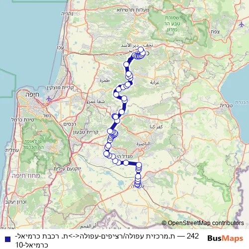 The first stop of the 242 bus route is ת.מרכזית עפולה/רציפים and the last stop is ת. רכבת כרמיאל. 242 (ת.מרכזית עפולה/רציפים-עפולה<->ת. רכבת כרמיאל-כרמיאל-10) is operational during ежедневно.