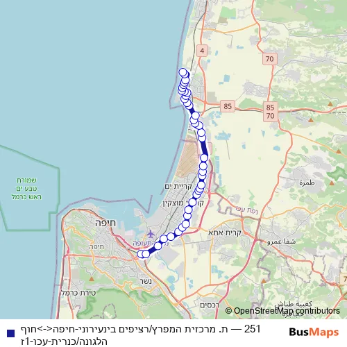 The first stop of the 251 bus route is ת. מרכזית המפרץ/רציפים בינעירוני and the last stop is חוף הלגונה/כנרית. 251 (ת. מרכזית המפרץ/רציפים בינעירוני-חיפה<->חוף הלגונה/כנרית-עכו-1ז) is operational during ежедневно.