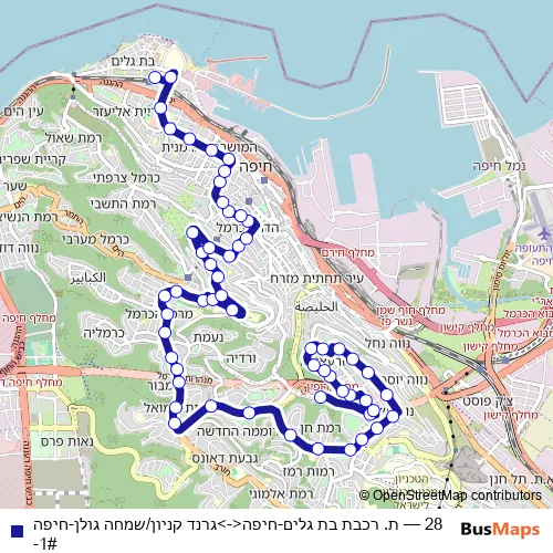 The first stop of the 28 bus route is גרנד קניון/שמחה גולן and the last stop is ת. רכבת בת גלים. 28 (ת. רכבת בת גלים-חיפה<->גרנד קניון/שמחה גולן-חיפה-1#) is operational during ежедневно.