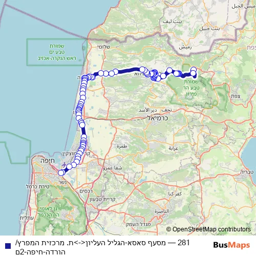 The first stop of the 281 bus route is מסעף סאסא and the last stop is ת. מרכזית המפרץ/הורדה. 281 (מסעף סאסא-הגליל העליון<->ת. מרכזית המפרץ/הורדה-חיפה-2ם) is operational during ежедневно.