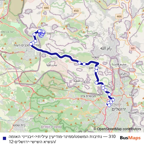 The first stop of the 310 bus route is משך חוכמה ב and the last stop is בנייני האומה/הנשיא השישי. 310 (נתיבות המשפט/סמינר-מודיעין עילית<->בנייני האומה/הנשיא השישי-ירושלים-12) is operational during ежедневно.