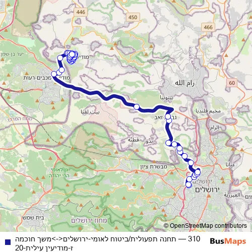 The first stop of the 310 bus route is תחנה תפעולית/ביטוח לאומי and the last stop is משך חוכמה ז. 310 (תחנה תפעולית/ביטוח לאומי-ירושלים<->משך חוכמה ז-מודיעין עילית-20) is operational during ежедневно.