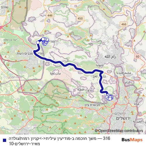 The first stop of the 316 bus route is משך חוכמה ב and the last stop is קניון רמות/גולדה מאיר. 316 (משך חוכמה ב-מודיעין עילית<->קניון רמות/גולדה מאיר-ירושלים-10) is operational during ежедневно.