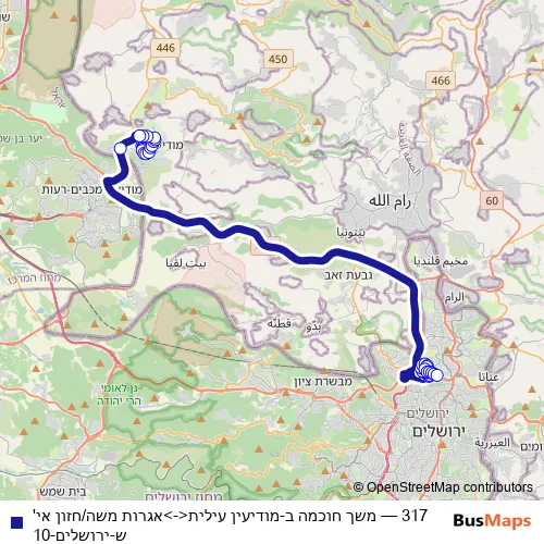 The first stop of the 317 bus route is משך חוכמה ב and the last stop is אגרות משה/חזון אי'ש. 317 (משך חוכמה ב-מודיעין עילית<->אגרות משה/חזון אי'ש-ירושלים-10) is operational during ежедневно.