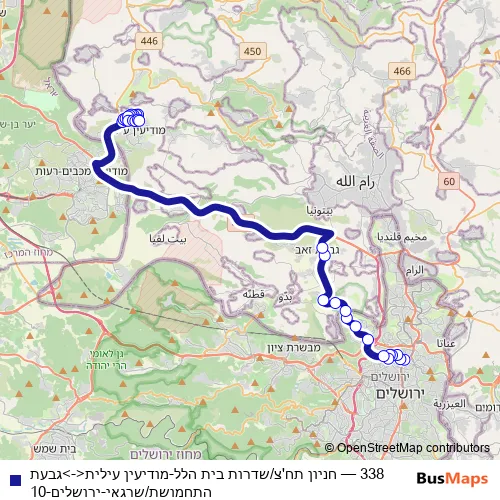 The first stop of the 338 bus route is גבעת התחמושת/שרגאי and the last stop is שדרות אביי ורבא/רבי טרפון. 338 (חניון תח'צ/שדרות בית הלל-מודיעין עילית<->גבעת התחמושת/שרגאי-ירושלים-10) is operational during ежедневно.