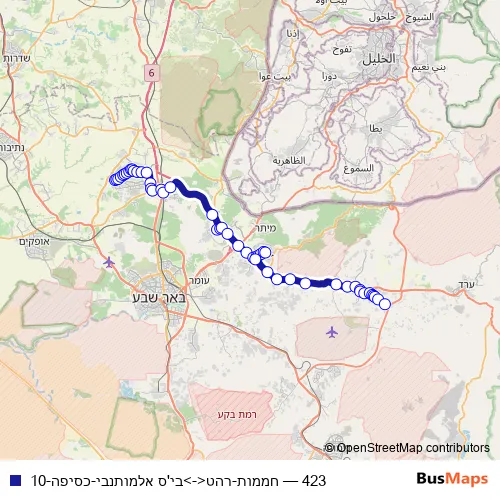 The first stop of the 423 bus route is חממות and the last stop is בי'ס אלמותנבי. 423 (חממות-רהט<->בי'ס אלמותנבי-כסיפה-10) is operational during ежедневно.