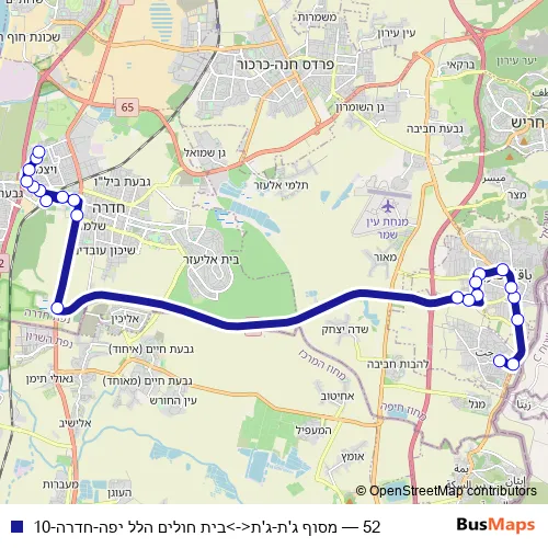 The first stop of the 52 bus route is מסוף ג'ת and the last stop is בית חולים הלל יפה. 52 (מסוף ג'ת-ג'ת<->בית חולים הלל יפה-חדרה-10) is operational during ежедневно.