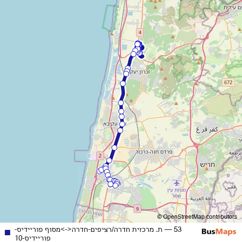 The first stop of the 53 bus route is מסוף פוריידיס and the last stop is ת. מרכזית חדרה/רציפים. 53 (ת. מרכזית חדרה/רציפים-חדרה<->מסוף פוריידיס-פוריידיס-10) is operational during ежедневно.