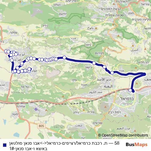 The first stop of the 58 bus route is אבו סנאן סולטאן באשא א and the last stop is ת. רכבת כרמיאל. 58 (ת. רכבת כרמיאל/רציפים-כרמיאל<->אבו סנאן סולטאן באשא ו-אבו סנאן-1#) is operational during ежедневно.