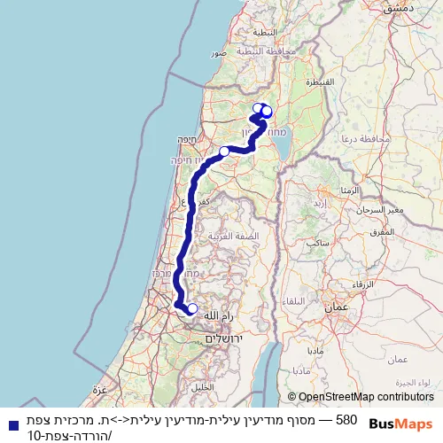 The first stop of the 580 bus route is מסוף מודיעין עילית and the last stop is ת. מרכזית צפת/הורדה. 580 (מסוף מודיעין עילית-מודיעין עילית<->ת. מרכזית צפת/הורדה-צפת-10) is operational during ежедневно.