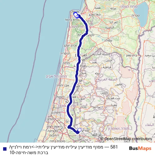 The first stop of the 581 bus route is מסוף מודיעין עילית and the last stop is רמת ויז'ניץ/ברכת משה. 581 (מסוף מודיעין עילית-מודיעין עילית<->רמת ויז'ניץ/ברכת משה-חיפה-10) is operational during ежедневно.