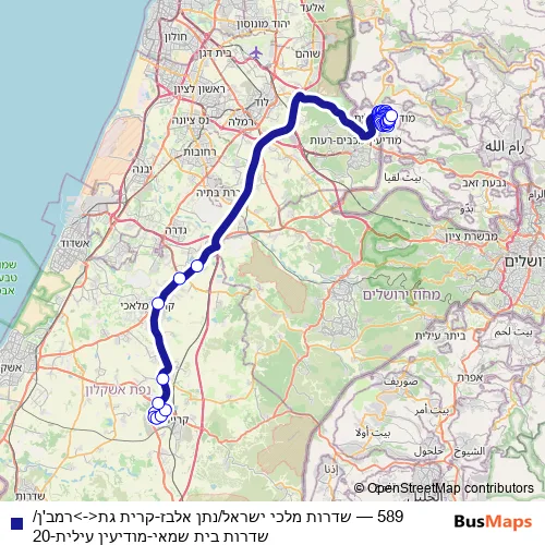 The first stop of the 589 bus route is שדרות מלכי ישראל/נתן אלבז and the last stop is רמב'ן/שדרות בית שמאי. 589 (שדרות מלכי ישראל/נתן אלבז-קרית גת<->רמב'ן/שדרות בית שמאי-מודיעין עילית-20) is operational during ежедневно.
