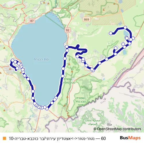 The first stop of the 60 bus route is נטור and the last stop is אצטדיון עירוני/בר כוכבא. 60 (נטור-נטור<->אצטדיון עירוני/בר כוכבא-טבריה-10) is operational during ежедневно.