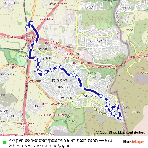 The first stop of the 73א bus route is תחנת רכבת ראש העין צפון/רציפים and the last stop is חבקוק/מרים הנביאה. 73א (תחנת רכבת ראש העין צפון/רציפים-ראש העין<->חבקוק/מרים הנביאה-ראש העין-20) is operational during ежедневно.