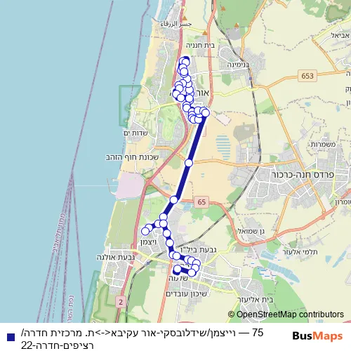 The first stop of the 75 bus route is וייצמן/שידלובסקי and the last stop is ת. מרכזית חדרה/רציפים. 75 (וייצמן/שידלובסקי-אור עקיבא<->ת. מרכזית חדרה/רציפים-חדרה-22) is operational during по выходным.