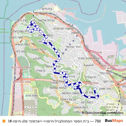 The first stop of the 788 bus route is בית הספר הפתוח/ברל and the last stop is אדמונד פלג. 788 (בית הספר הפתוח/ברל-חיפה<->אדמונד פלג-חיפה-1#) is operational during ежедневно.