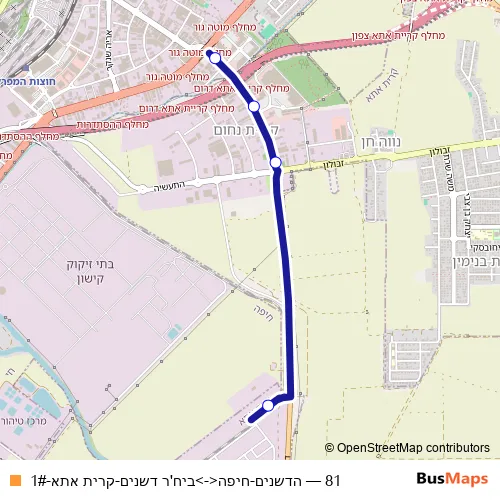 The first stop of the 81 bus route is ביח'ר דשנים and the last stop is דרך הדשנים/צומת קרית אתא. 81 (הדשנים-חיפה<->ביח'ר דשנים-קרית אתא-1#) is operational during ежедневно.