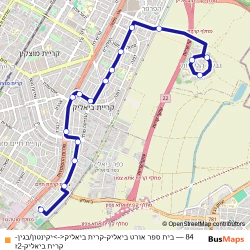 The first stop of the 84 bus route is בית ספר אורט ביאליק and the last stop is יקינטון/בגין. 84 (בית ספר אורט ביאליק-קרית ביאליק<->יקינטון/בגין-קרית ביאליק-2ז) is operational during ежедневно.