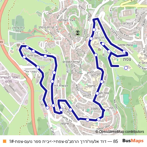 The first stop of the 85 bus route is דוד אלעזר/דרך הרמב'ם and the last stop is בית ספר נועם. 85 (דוד אלעזר/דרך הרמב'ם-צפת<->בית ספר נועם-צפת-1#) is operational during ежедневно.