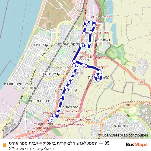 The first stop of the 85 bus route is יוספטל/גוש חלב and the last stop is בית ספר אורט ביאליק. 85 (יוספטל/גוש חלב-קרית ביאליק<->בית ספר אורט ביאליק-קרית ביאליק-2#) is operational during ежедневно.