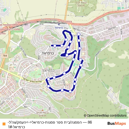 The first stop of the 86 bus route is הפסגה/בית ספר פסגות and the last stop is העמק/צה'ל. 86 (הפסגה/בית ספר פסגות-כרמיאל<->העמק/צה'ל-כרמיאל-1#) is operational during ежедневно.