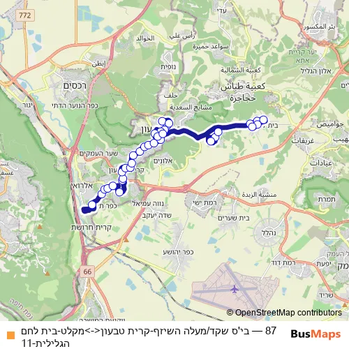 The first stop of the 87 bus route is בי'ס שקד/מעלה השיזף and the last stop is מקלט. 87 (בי'ס שקד/מעלה השיזף-קרית טבעון<->מקלט-בית לחם הגלילית-11) is operational during ежедневно.