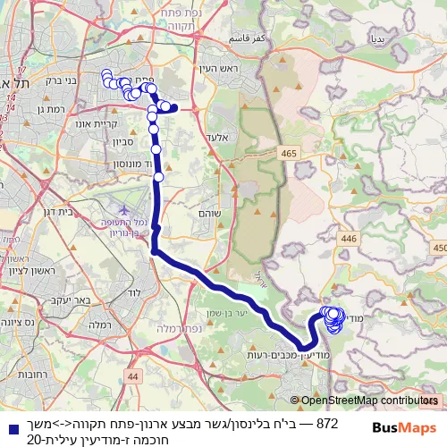 The first stop of the 872 bus route is בי'ח בלינסון/גשר מבצע ארנון and the last stop is משך חוכמה ז. 872 (בי'ח בלינסון/גשר מבצע ארנון-פתח תקווה<->משך חוכמה ז-מודיעין עילית-20) is operational during ежедневно.