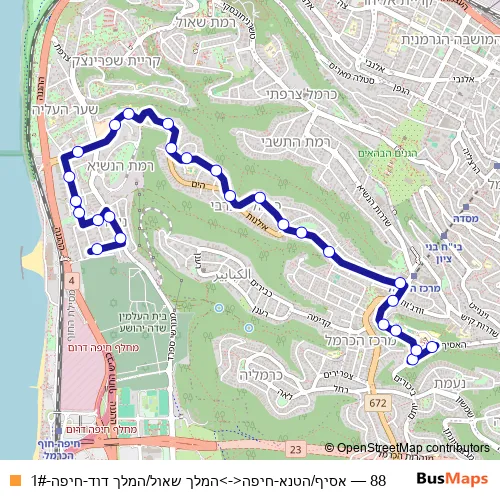 The first stop of the 88 bus route is אסיף/הטנא and the last stop is המלך שאול/המלך דוד. 88 (אסיף/הטנא-חיפה<->המלך שאול/המלך דוד-חיפה-1#) is operational during ежедневно.