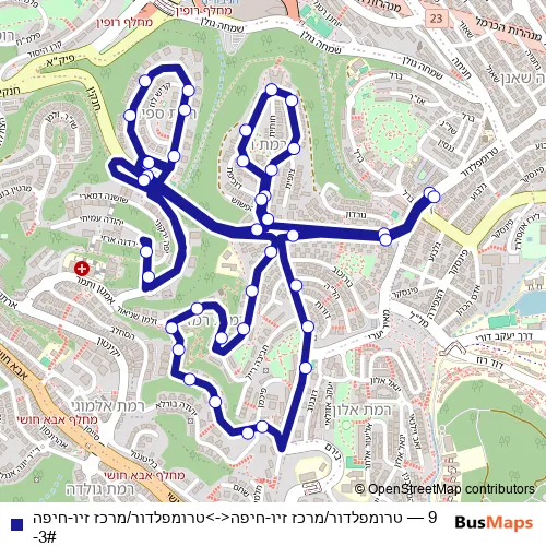 The first stop of the 9 bus route is טרומפלדור/מרכז זיו and the last stop is טרומפלדור/מרכז זיו. 9 (טרומפלדור/מרכז זיו-חיפה<->טרומפלדור/מרכז זיו-חיפה-3#) is operational during ежедневно.