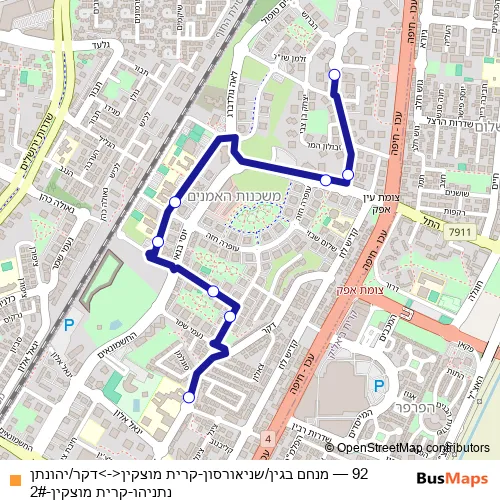 The first stop of the 92 bus route is מנחם בגין/שניאורסון and the last stop is דקר/יהונתן נתניהו. 92 (מנחם בגין/שניאורסון-קרית מוצקין<->דקר/יהונתן נתניהו-קרית מוצקין-2#) is operational during ежедневно.