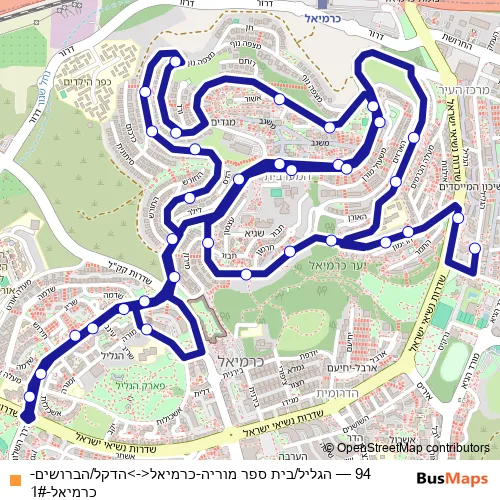 The first stop of the 94 bus route is הגליל/בית ספר מוריה and the last stop is הדקל/הברושים. 94 (הגליל/בית ספר מוריה-כרמיאל<->הדקל/הברושים-כרמיאל-1#) is operational during ежедневно.