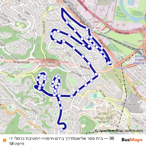 Bus 96 - בית ספר אליאנס/דרך בירם-חיפה<->חטיבת כרמלי ד-חיפה-1# in Haifa: Stops & Timetable