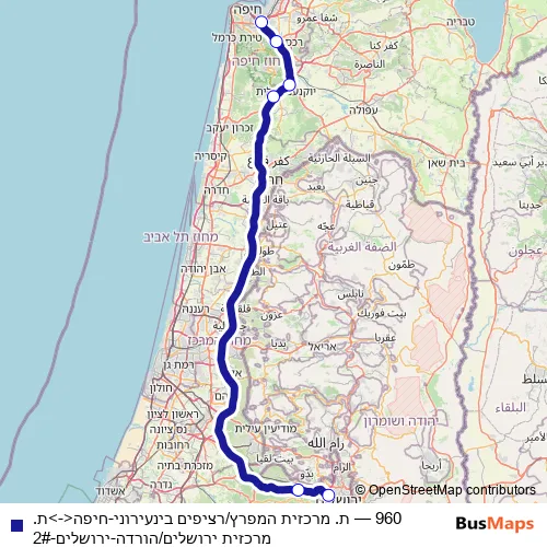 The first stop of the 960 bus route is ת. מרכזית המפרץ/רציפים בינעירוני and the last stop is ת. מרכזית ירושלים/הורדה. 960 (ת. מרכזית המפרץ/רציפים בינעירוני-חיפה<->ת. מרכזית ירושלים/הורדה-ירושלים-2#) is operational during ежедневно.