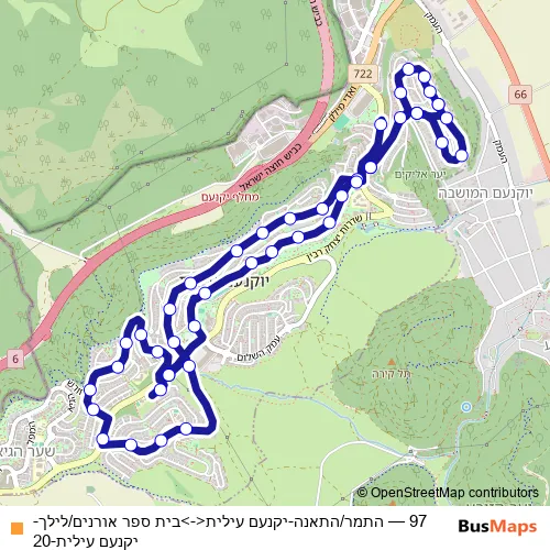 The first stop of the 97 bus route is התמר/התאנה and the last stop is בית ספר אורנים/לילך. 97 (התמר/התאנה-יקנעם עילית<->בית ספר אורנים/לילך-יקנעם עילית-20) is operational during ежедневно.