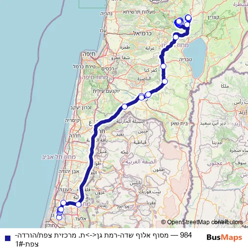 The first stop of the 984 bus route is מסוף אלוף שדה and the last stop is ת. מרכזית צפת/הורדה. 984 (מסוף אלוף שדה-רמת גן<->ת. מרכזית צפת/הורדה-צפת-1#) is operational during ежедневно.