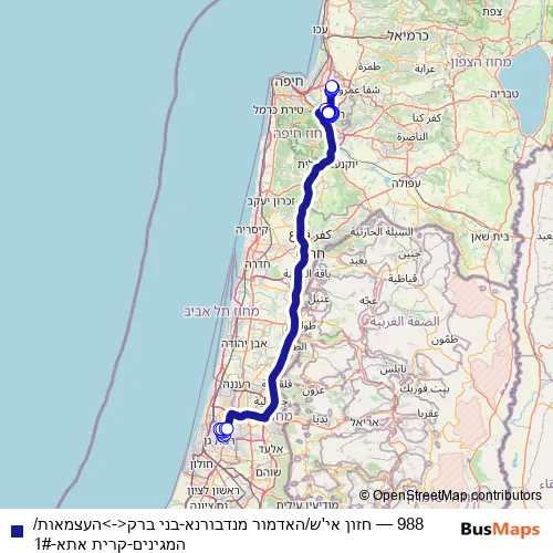 See why over 2 million users trust and consider busmaps.com as the best public transport website. busmaps gives you Haifa Buses suggested routes, real-time bus tracker, line route maps in Haifa, and helps to find the closest 988 bus stops near you. No internet available? Download an offline PDF map and bus schedule for the 988 bus to take on your trip.