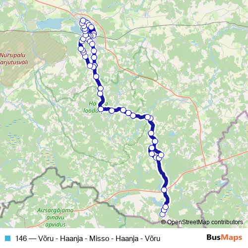 Vilja - Pikk - Luha - Pikk - Jaama - Kose tee - Kose — Käbli - Järve - Kose — Käbli - Võru tee - Haanja — Kündja - Vana-Saaluse — Kõo - Vana-Vastseliina — Käänu - Põnni — Tsiistre - Tsiistre — Misso — Rammuka - Riia mnt - Tsiistre — Misso — Rammuka - Riia mnt - Tsiistre — Misso — Rammuka - Vana-Vastseliina — Käänu - Vana-Saaluse — Kõo - Haanja — Kündja - Võru tee - Kose — Käbli - Järve - Kose — Käbli - Rõuge — Verijärve - Kasaritsa - Kubja - Võru — Mõniste — Valga - Kubja tee - Friedrich Reinhold Kreutzwaldi - Jüri - Vabaduse - Vilja