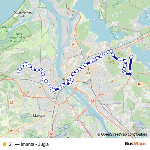 The first stop of the 21 bus route is Imantas D/P and the last stop is Jugla. 21 (Imanta - Jugla) is operational during ежедневно.