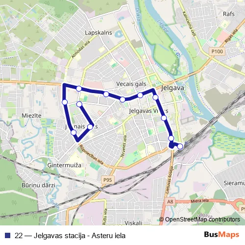 The first stop of the 22 bus route is Asteru iela and the last stop is Jelgavas stacija. 22 (Jelgavas stacija - Asteru iela) is operational during ежедневно.
